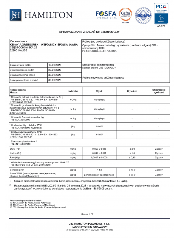 Składniki: sproszkowany sok z trawy młodego jęczmienia (Hordeum vulgare)
