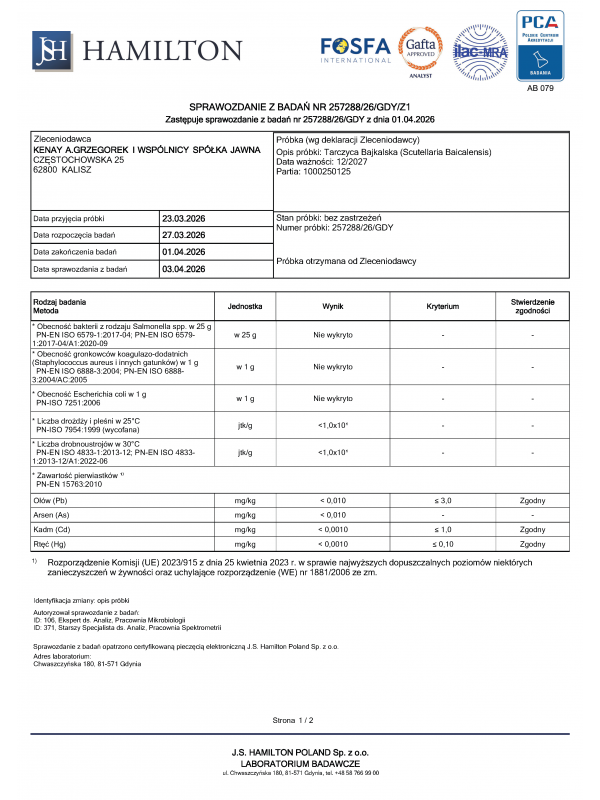 | Ekstrakt z tarczycy bajkalskiej (Scutellaria Baicalensis) (korzeń), w tym: - bajkalina: 85% |