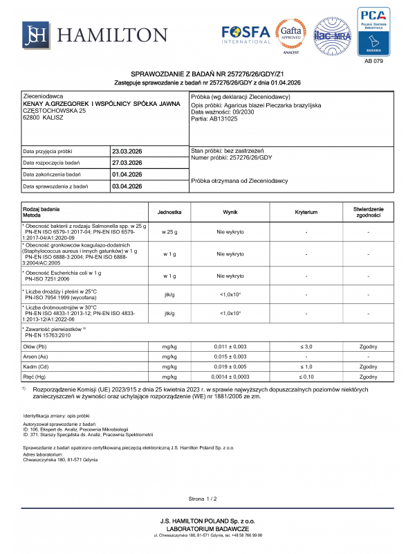 | Ekologiczny ekstrakt z grzyba pieczarki brazylijskiej (owocniki) Agaricus Blazei, w tym: | 1 000 mg |