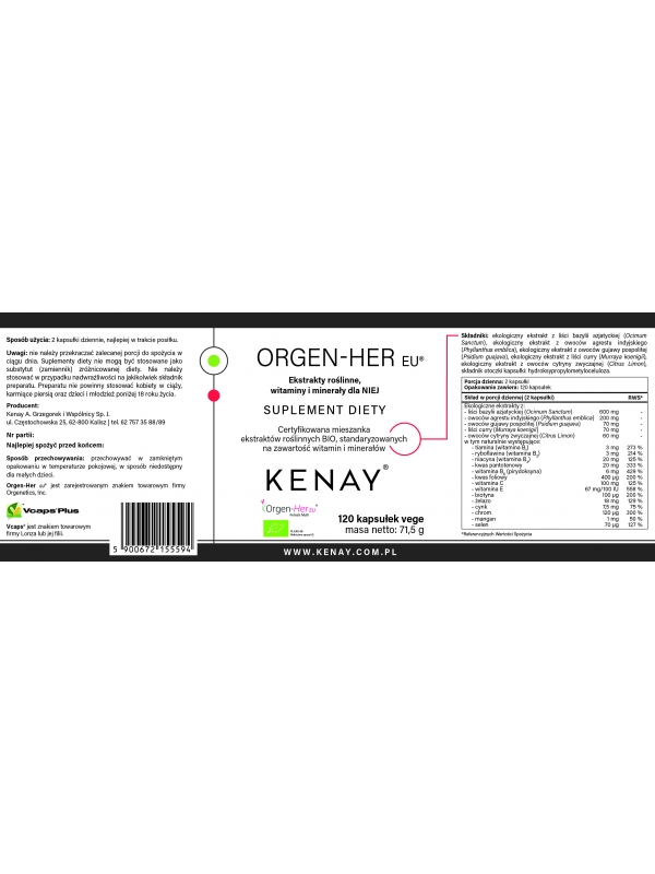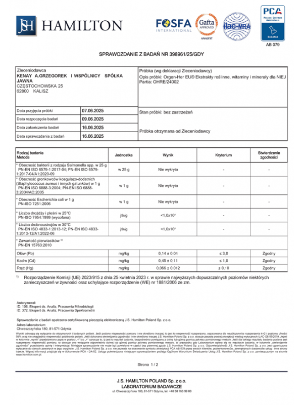 Orgen-Her EU® łączy ekologiczne ekstrakty roślinne BIO z pełnym kompleksem witamin i minerałów, co daje wsparcie nie tylko odżywcze, ale także fitoskładnikowe — roślinne bioaktywne związki wspierają synergicznie działanie witamin.